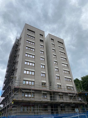 Cladding removed back to the CP board, we designed the new helping hand bracket & rail systems along with all other ancillary parts, including capping’s, new Aluminium decking for the in-set and bolt on balconies and the cladding re-instated